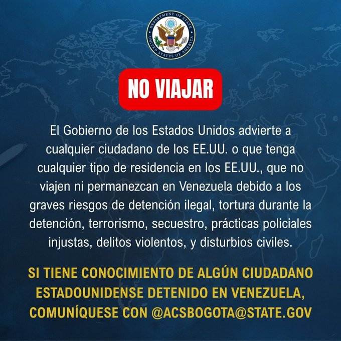Con este comunicado, Washington endurece su postura y envía un mensaje claro: no viajar a Venezuela hasta nuevo aviso.